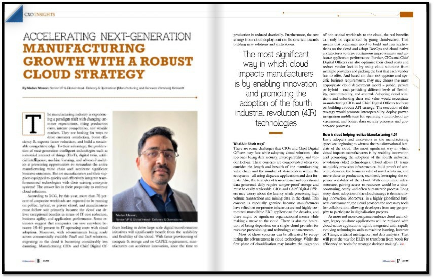 According to BCG, by this year, more than 70% of corporate workloads are expected to be running on public-, hybrid-, or private-cloud. And manufacturers must follow suit. Primarily because the cloud can deliver exceptional benefits in terms of IT cost reduction, business agility, and application performance. Some estimates suggest companies can save anywhere between 15-40 percent in IT operating costs with cloud adoption. Moreover, with advancements being made across commercially available PaaS and IaaS solutions, migrating to the cloud is becoming considerably less daunting. Manufacturing CIOs and Chief Digital Officers looking to drive large scale digital transformation initiatives will significantly benefit from the scalability and flexibility of the cloud. With faster provisioning of compute and storage and no CAPEX requirement, manufacturers can accelerate innovation since the time to production is reduced drastically. Furthermore, the cost savings from cloud deployment can be diverted towards building new solutions and applications.
