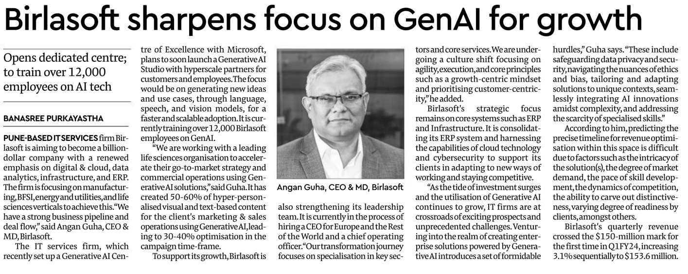 The IT services firm, which recently set up a Generative AI Centre of Excellence with Microsoft, plans to soon launch a Generative AI Studio with hyperscale partners for customers and employees. The focus would be on generating new ideas and use cases, through language, speech, and vision models, for a faster and scalable adoption. It is currently training over 12,000 Birlasoft employees on GenAI.