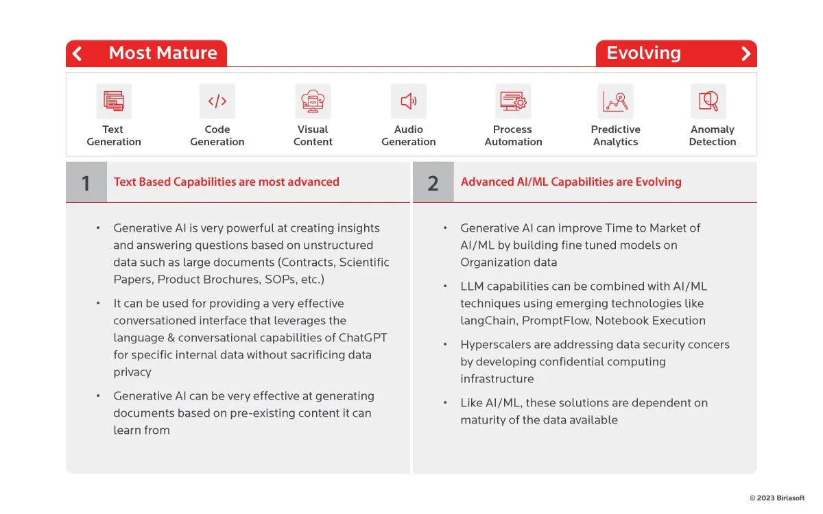 Generative AI for business has ushered in a new era of innovation, offering fresh perspectives and solutions to complex industry challenges. However, not all capabilities within the realm of Generative AI have reached the same level of maturity. The journey of enterprise adoption hinges on addressing critical concerns surrounding Return on Investment (ROI), data privacy and reputational risk. It is essential to understand the mature and emerging capabilities of Generative AI.