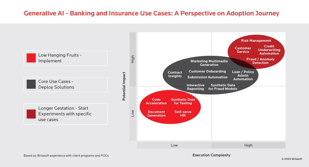 Leveraging the mature and evolving capabilities of Generative AI, Birlasoft has developed a specialized framework to help BFSI organizations identify use cases with the potential to deliver substantial impact and ease of execution. The framework is tailored separately for the Banking and Insurance industries, acknowledging the nuanced variations in use cases between these sectors. Through this strategic approach, Birlasoft can empower BFSI organizations to harness the full potential of Generative AI.