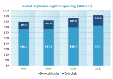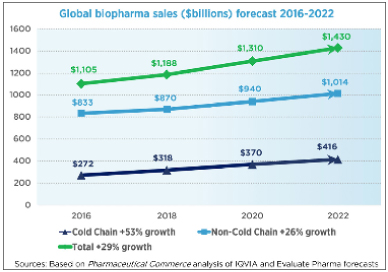 Cold chain logistics play a critical role in the safe delivery of perishable goods, pharmaceuticals, chemicals, etc. It is the backbone of a rapidly evolving pharmaceuticals industry. According to Pharmaceutical Commerce, the global cold chain and biopharma drug sales is forecasted to hit $416 billion by 2022—a 31% growth since 2018. It outpaces the non cold chain growth, which is 17% during the same time frame.