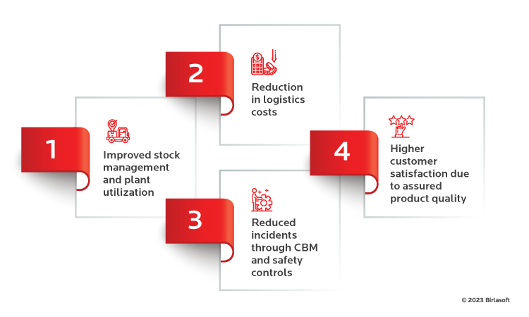 Birlasoft enabled a Global Building Materials Company to drive customer excellence, optimize operational efficiency, and improve employee health and safety with the IntelliAsset for Silos Solution, developed on an Industrial IoT Platform. A critical part of their supply chain has been automated with this solution – including timely delivery of cement to RMX plants, automated re-ordering, driver behavior tracking, and fleet optimization. The other advantages include the following: