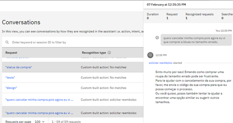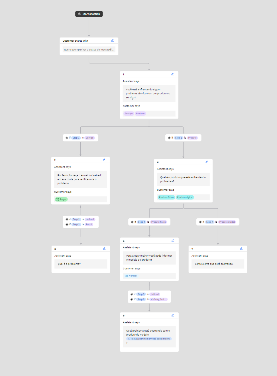 As ações oferecem a opção de visualização em formato de diagrama, facilitando a compreensão do comportamento do assistente. Esse modelo torna tanto o desenvolvimento quanto a análise do fluxo da conversa mais intuitivos.