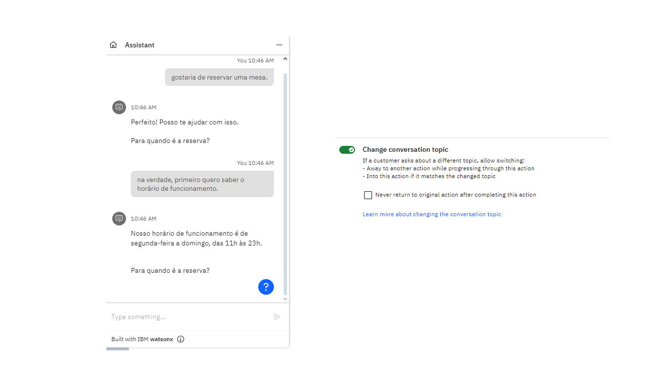 Esse recurso do Watson Assistant é uma funcionalidade poderosa que permite ao assistente lidar com desvio de assuntos de forma fluida e sem interrupções para o usuário.