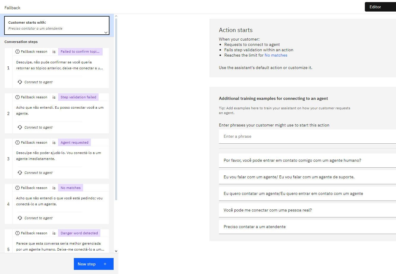 Na nova versão, temos uma ação de fallback acionada em cenários de erro, e o assistente também configura um valor que indica o que causou o acionamento dessa ação, que pode ser um desses valores: