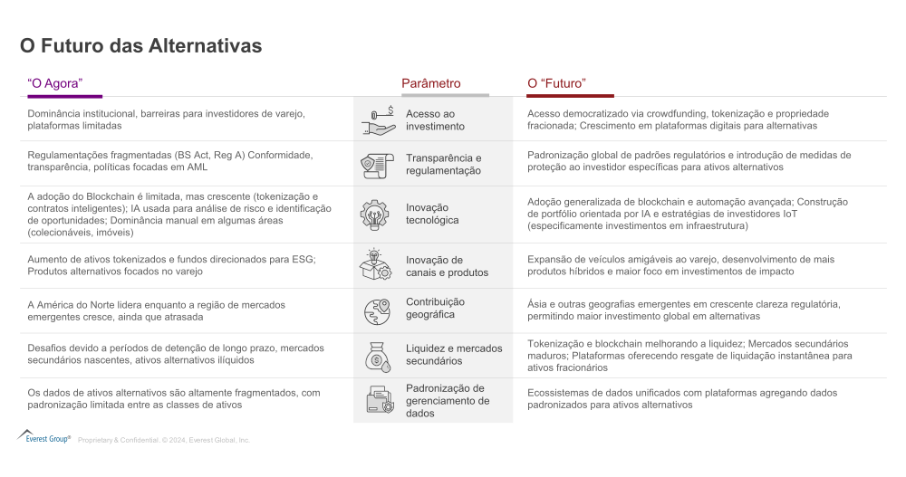 Esses fatores, combinados com a inovação em ofertas de produtos, como fundos híbridos que combinam mercados públicos e privados, juntamente com estratégias focadas em ESG, estão atendendo às prioridades dos investidores em evolução, aumentando ainda mais o apelo dos ativos alternativos.