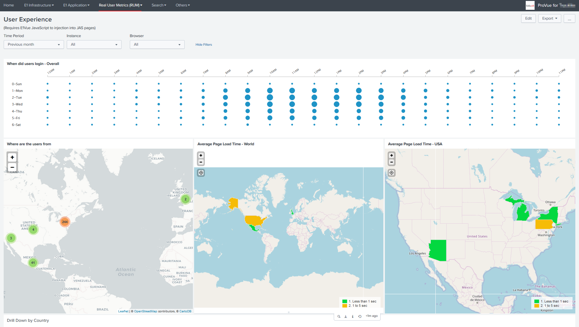 RUM captures performance metrics from inside a user’s browser. It can identify and track each user session, including entire click paths (applications that a user opens in JDE and actions performed on those). This information is needed to monitor performance, provide high-quality service monitoring, and quickly resolve issues when problems are detected.