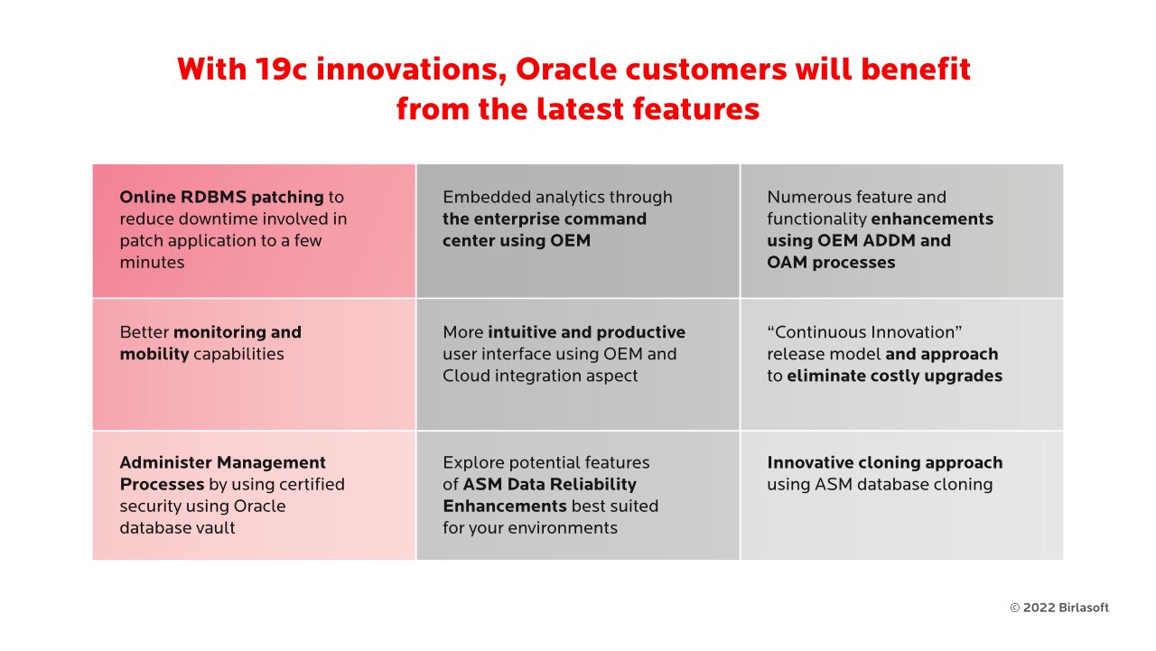 To future proof your Oracle database investments upgrade to Oracle database 19c which includes new features, long term support from Oracle.